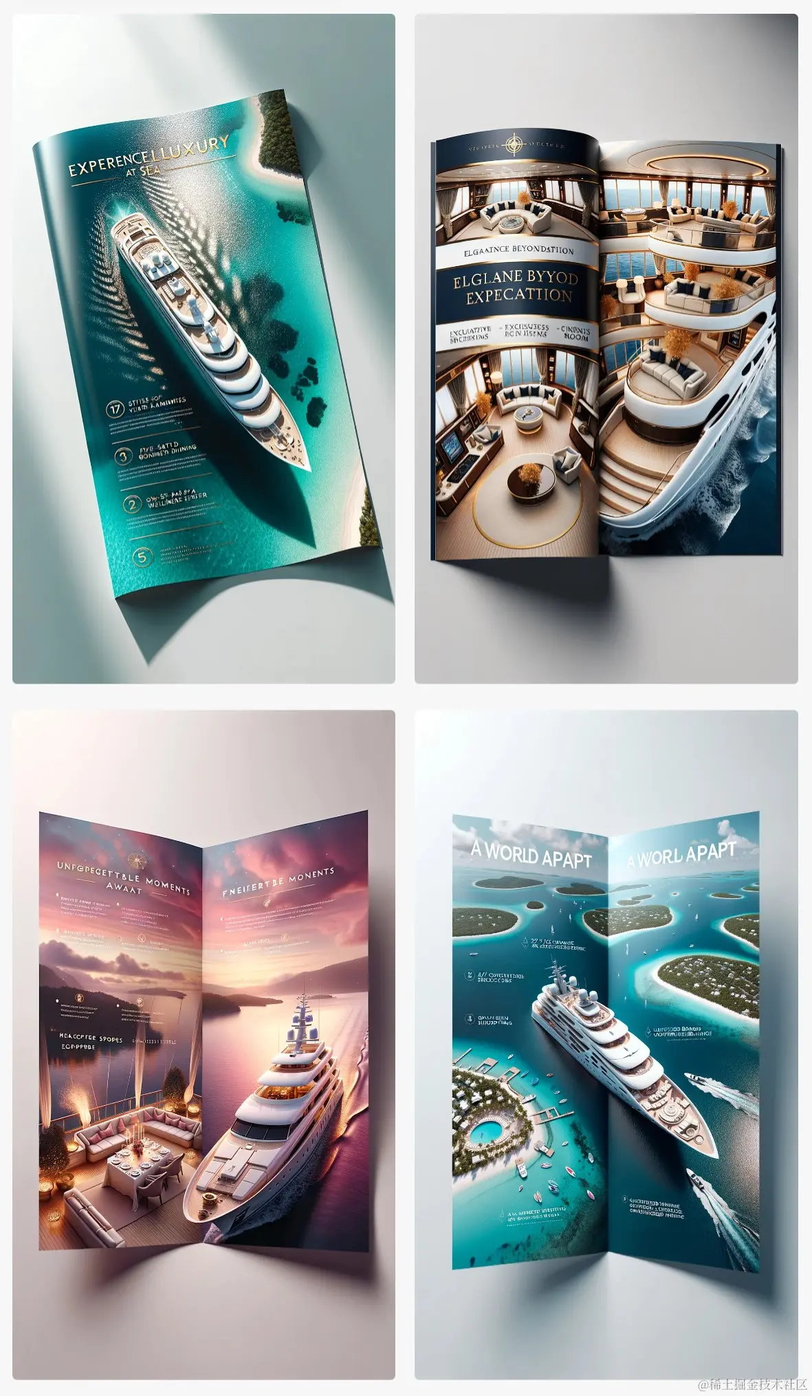 举例: Design visually appealing brochures for a luxury yacht charter, highlighting the key features of yacht amenities, and incorporating imagery that resonates with luxury and oceanic beauty. (Tall)