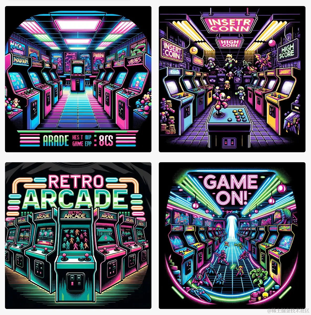 举例: Design creative vector graphics for a T-shirt showcasing a retro arcade, incorporating elements that resonate with nostalgia and fun, and featuring pixelated characters and neon lights. The design should be suitable for a black round-neck T-shirt.