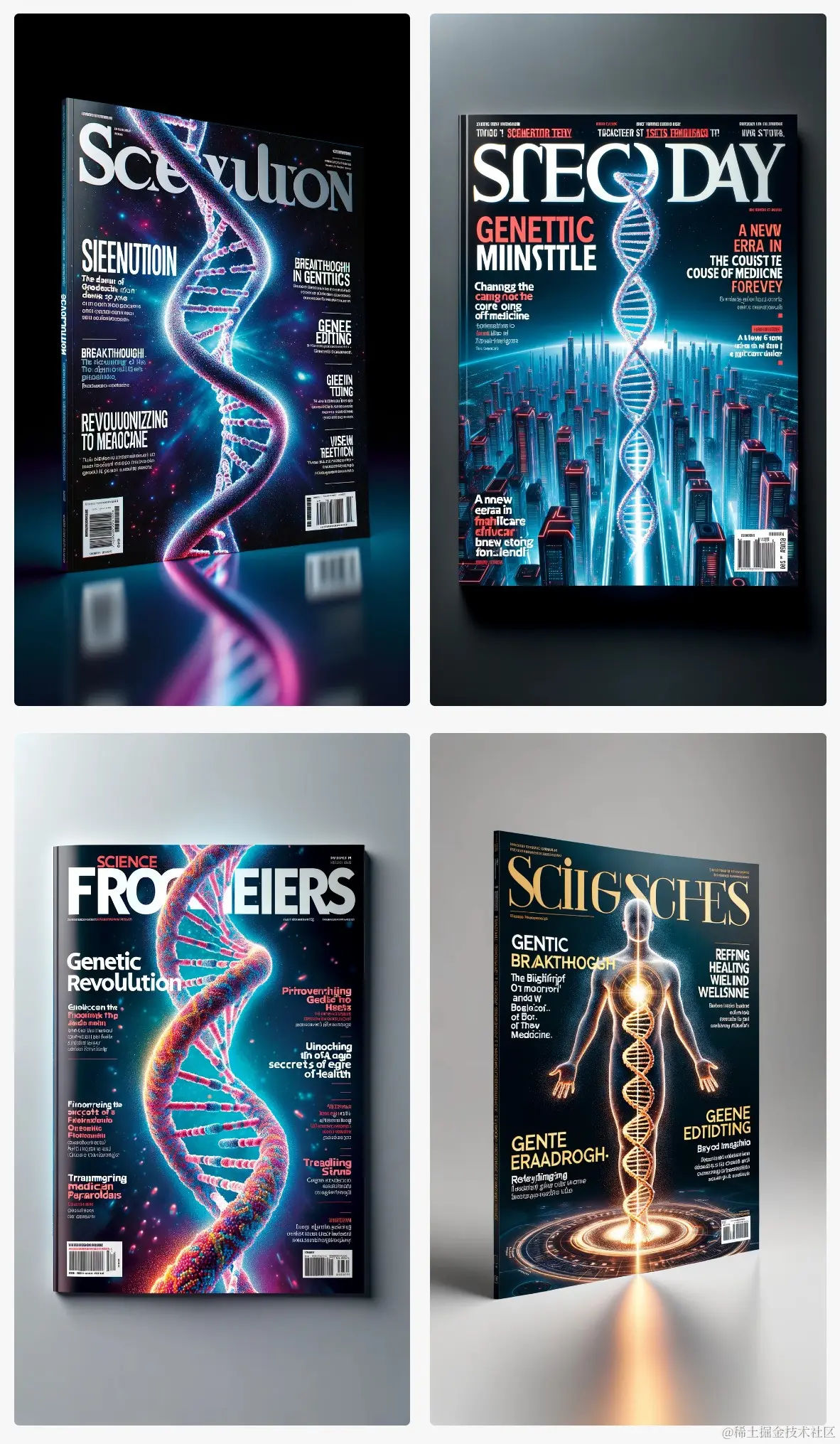 举例: Design visually striking magazine covers for science, featuring a breakthrough discovery in genetics, complemented by headlines hinting at revolutionizing healthcare with gene editing. (Tall)