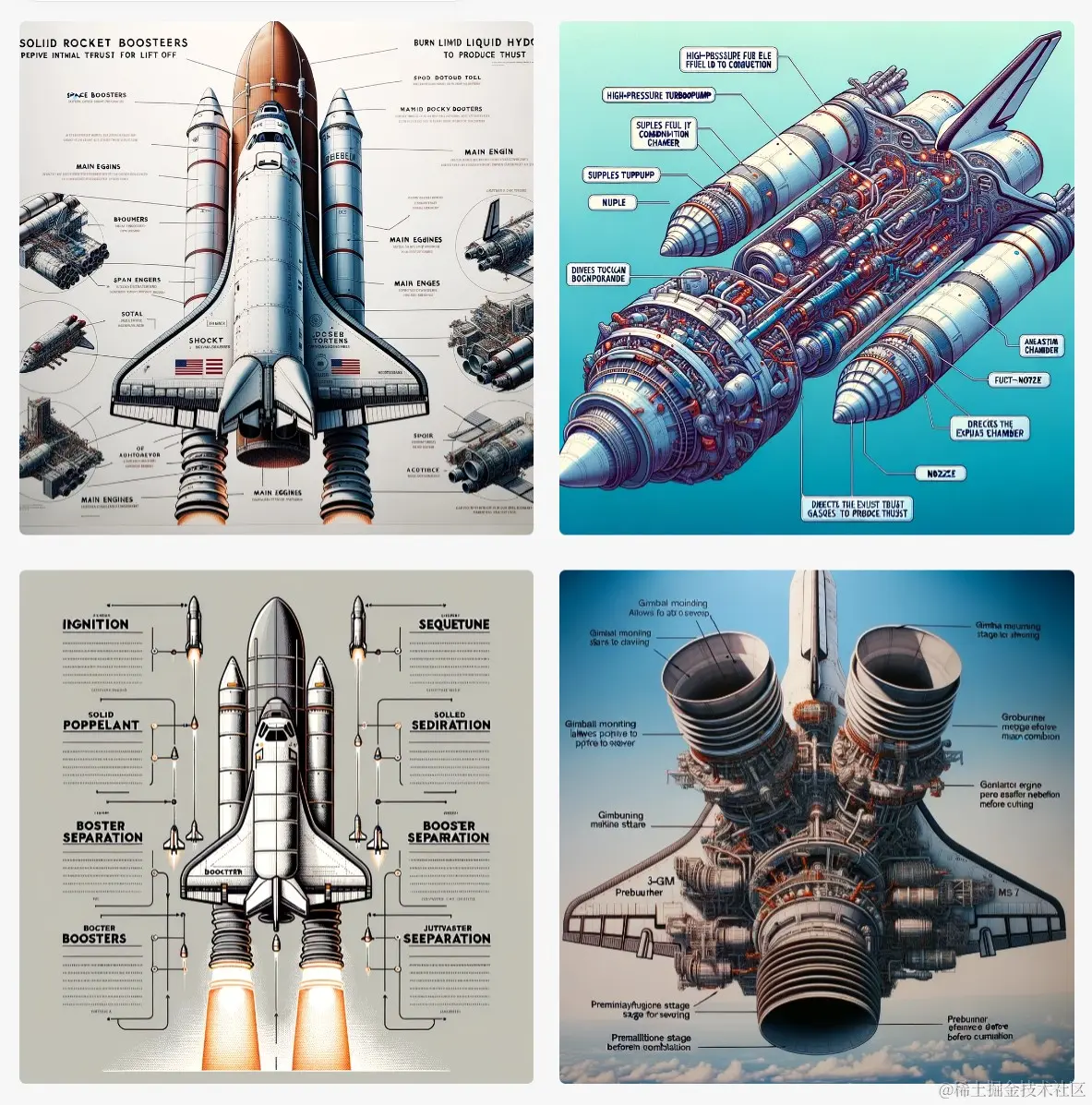 举例: Illustrate detailed technical diagrams of a space shuttle] highlighting its rocket boosters and main engines, with annotations explaining propulsion and liftoff processes. Ensure clarity and precision in the representation.