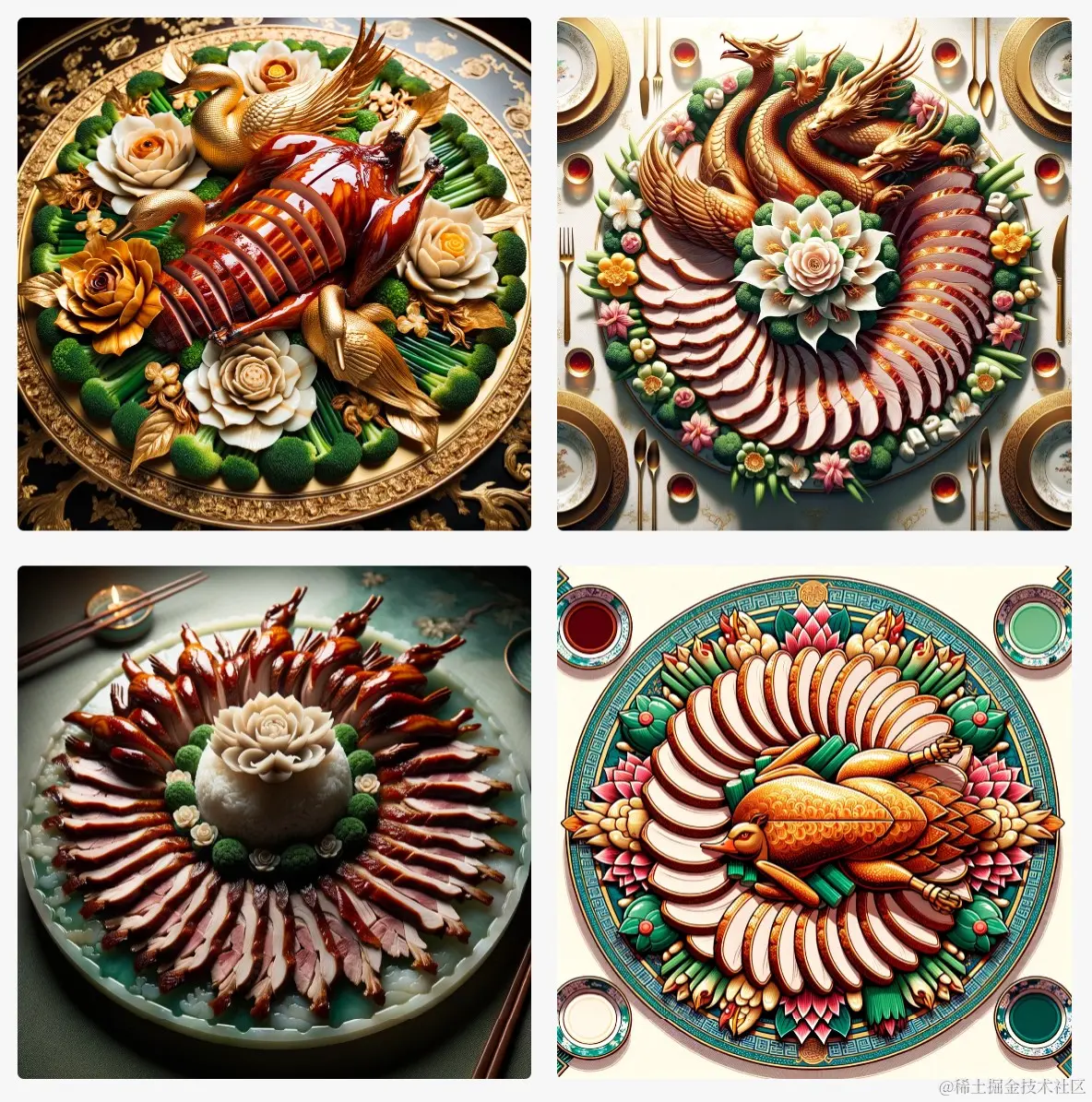 举例: Design visually stunning culinary presentations for a regal Peking dish named "Emperor's Feast", incorporating elements that highlight tender slices of roast duck and ornate vegetable carvings.