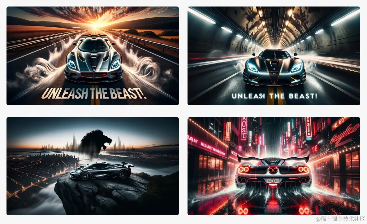 举例: Design striking photo billboards for a new luxury sports car by ExoticMotors, emphasizing its roaring engine and sleek aerodynamics. Ensure the visual layout attracts attention from a distance and includes a "Unleash the Beast!" call-to-action.