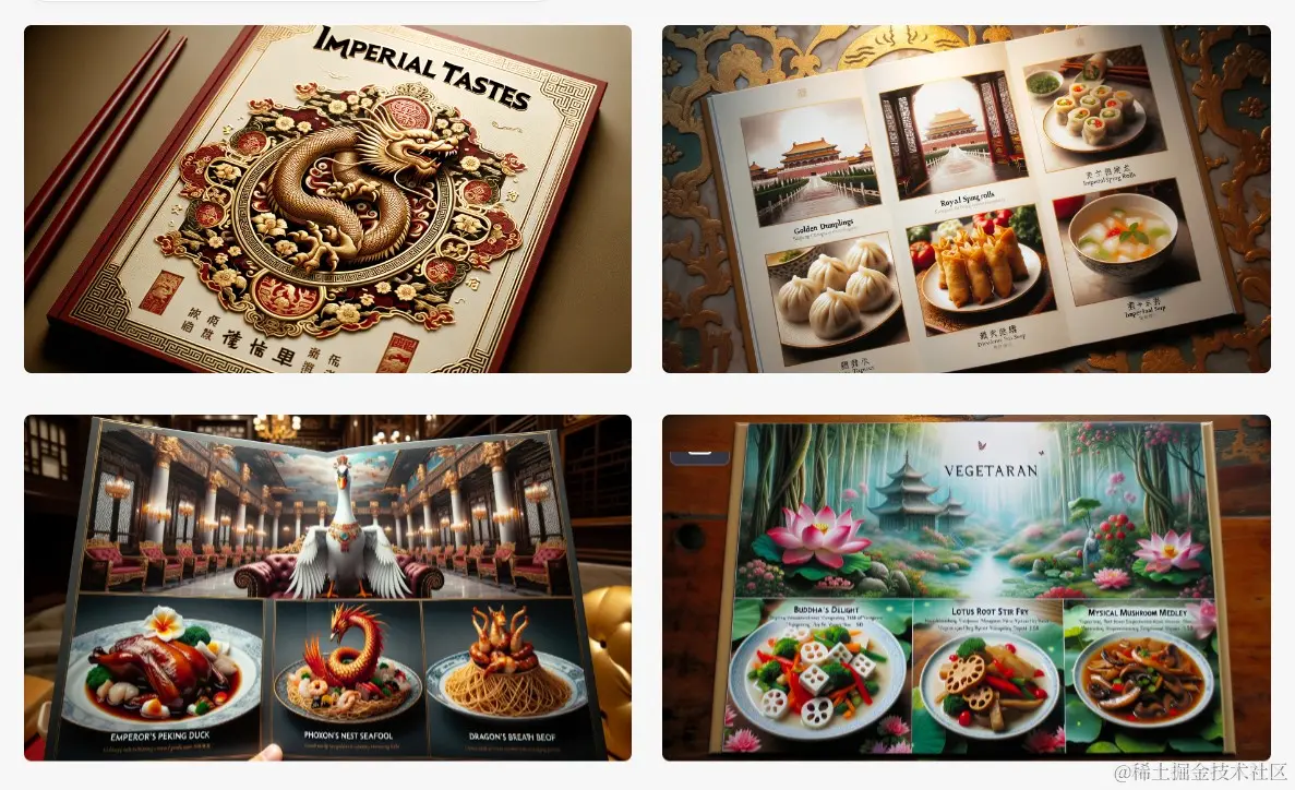 举例: Design visually appealing photo restaurant menus for a Chinese eatery named "Imperial Tastes", highlighting dishes that embody imperial banquet classics. The menu should have sections for appetizers, royal entrees, vegetarian delights, and regal desserts.