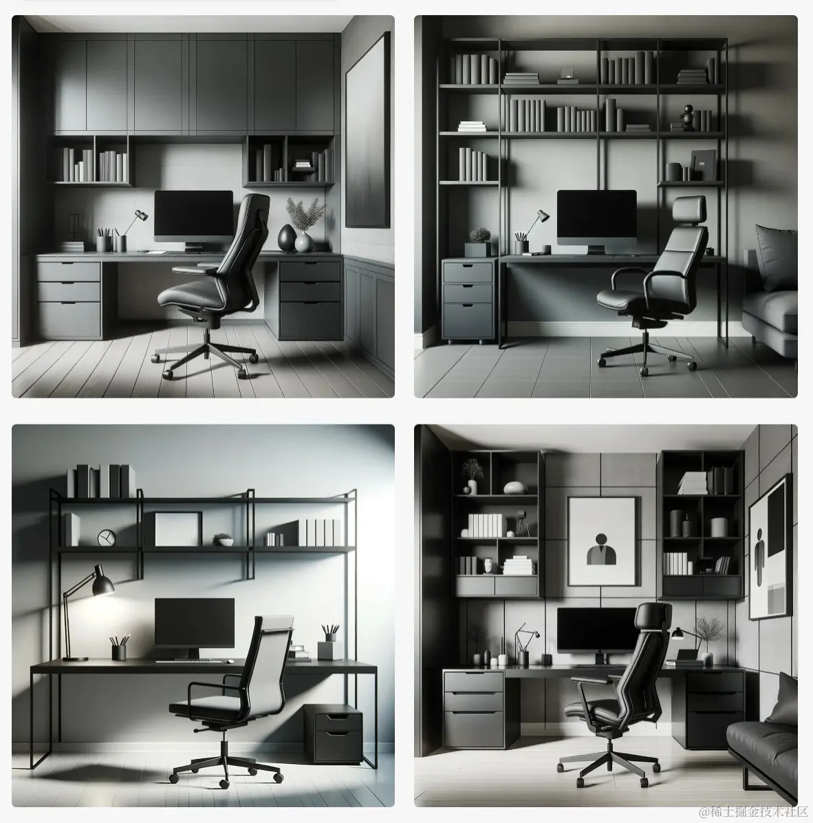 举例: Visualize cohesive interior designs for a home office with a minimalist aesthetic, incorporating elements that resonate with efficiency and productivity. Ensure the space includes a sleek desk, ergonomic chair, and ample storage, and is adorned with tones of black and gray.