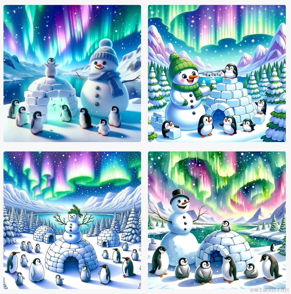 举例: Illustrate vibrant scenes for a children's book set in a snowy wonderland, featuring a friendly snowman and a group of lively penguins, engaging in building an igloo village as the northern lights dance in the sky.