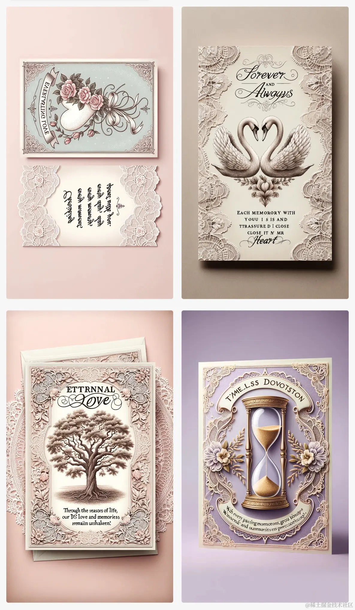 举例: Design heartfelt greeting cards for a wedding anniversary with a a vintage lace design, incorporating a message that conveys everlasting love and cherished memories. (Tall)