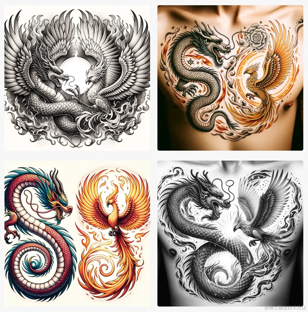 举例: Design unique drawing tattoos symbolizing transformation and rebirth for the chest, incorporating elements like a soaring Chinese dragon and a phoenix in flight.