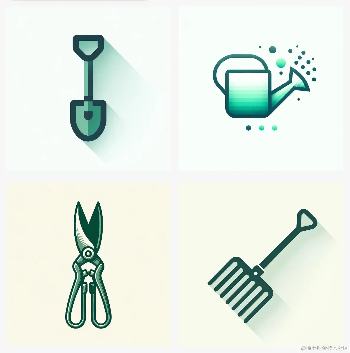 举例: Design sleek vector icons representing gardening tools, utilizing shades of green, and embodying a simple and practical style.
