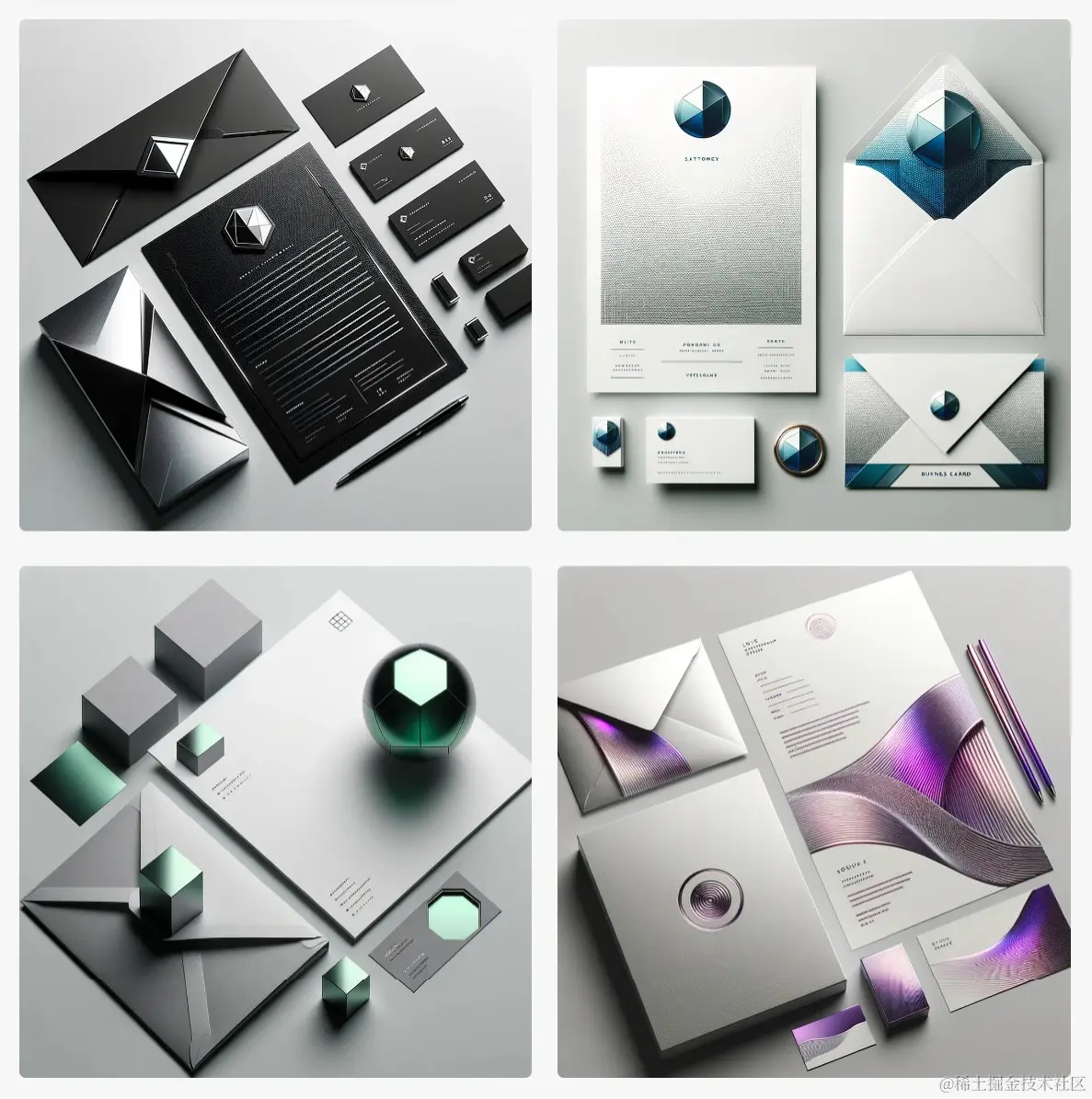 举例: Top down view of 4 cohesive sets of stationery for a tech startup with the theme of "futuristic minimalism," including elements such as sleek geometric shapes and metallic accents. The set should consist of a letterhead, envelope, and business card, reflecting the essence of innovation and modernity.