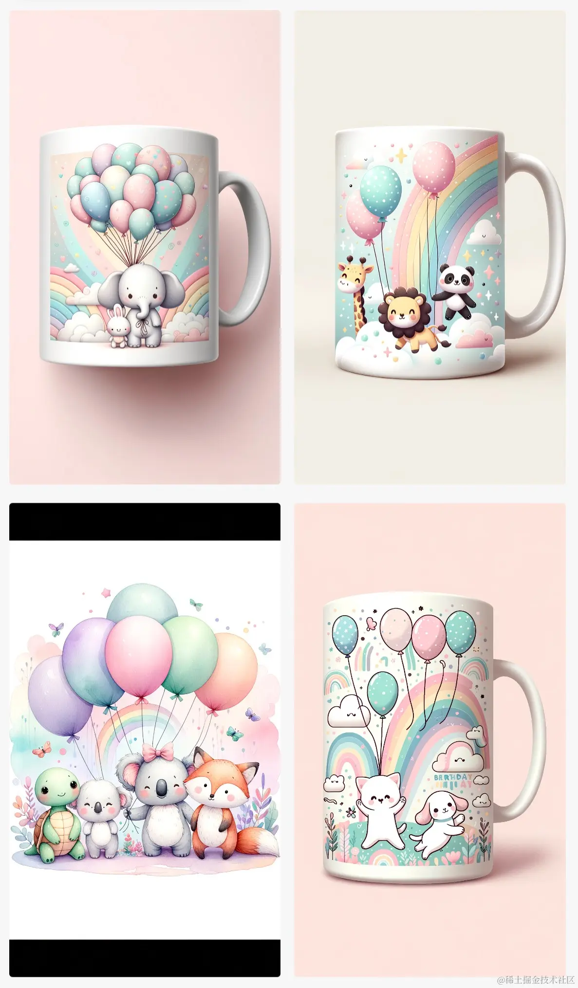 举例: Design whimsical mug prints for a child's birthday party featuring adorable animals and balloons with a touch of pastel rainbow accents. (Tall)