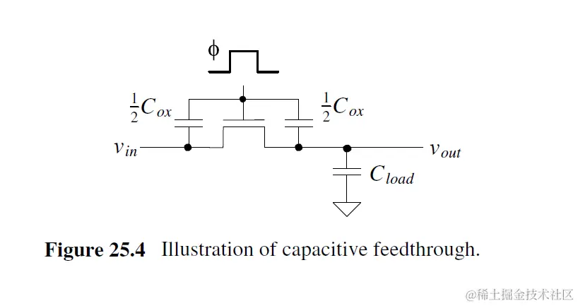 当phi=gate signal升高, NMOS on Vout=Vin, Capacitive Feedthrough没影响 当phi=gate signal变低, NMOS off, A capacitive voltage divider exists between the gate-drain (source) capacitance and the load capacitance. 形成了vin-gate-vout的 capacitive voltage divider