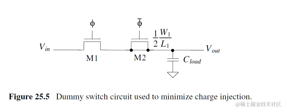 M1 off 时, 一半的channel charge注入到M2 (所以M2的size为M1的一半), M2 gate on吸收charge. 当M2 off时, It will inject half of its charge in both directions. 但是M1 on, M2的所有charge会注入到low-impedance 点也就是Vin, 不会影响到Vout.