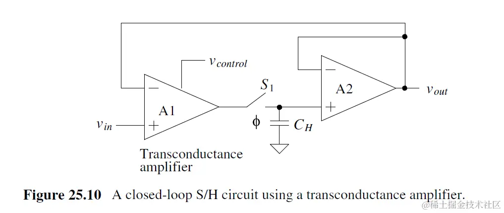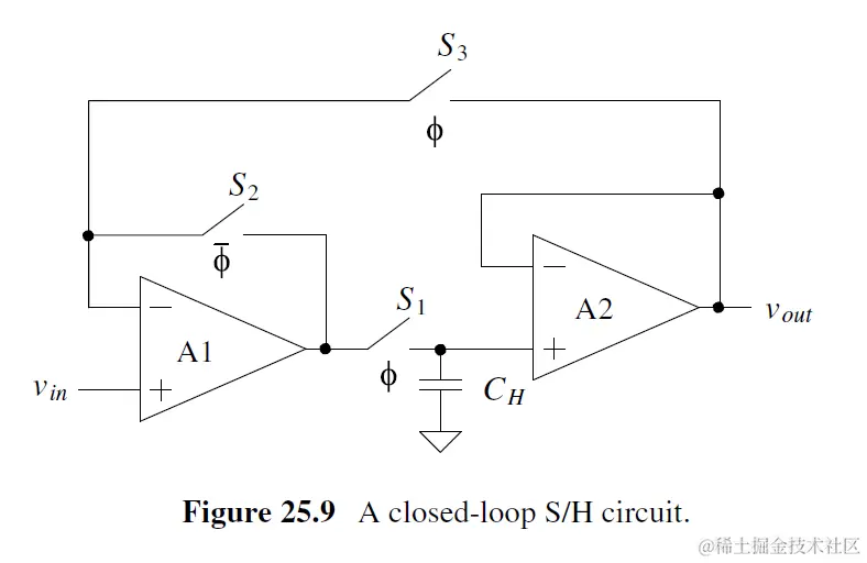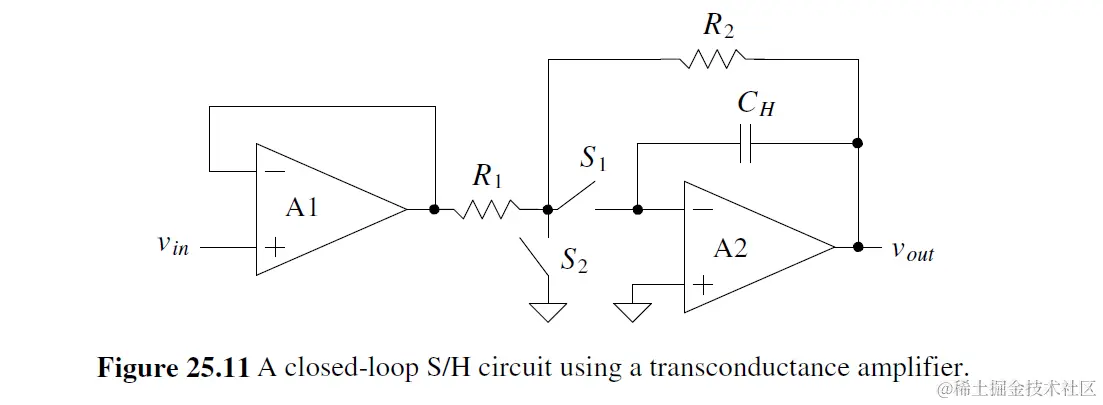在hold时, vout=vin, while the switch S2 isolates the input from the hold capacitor. A2 需要为buffered op-amp因为接电阻负载.