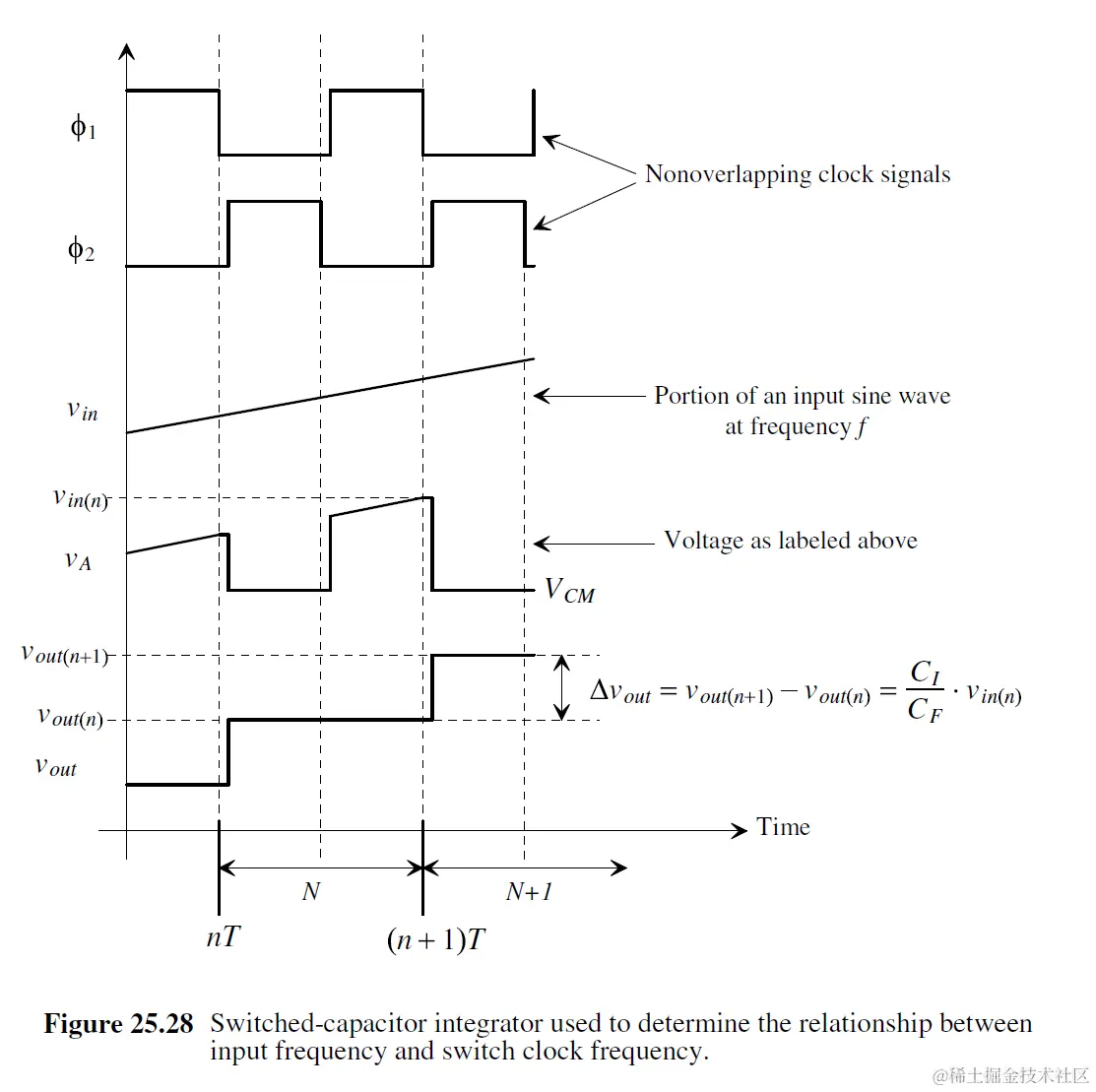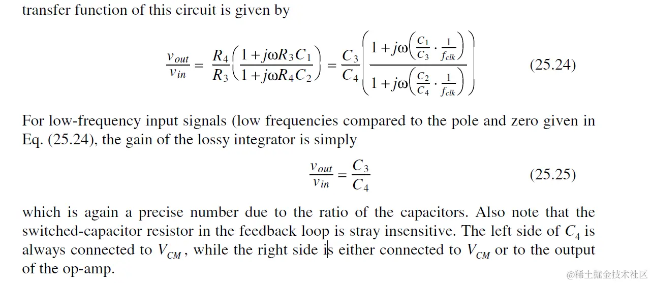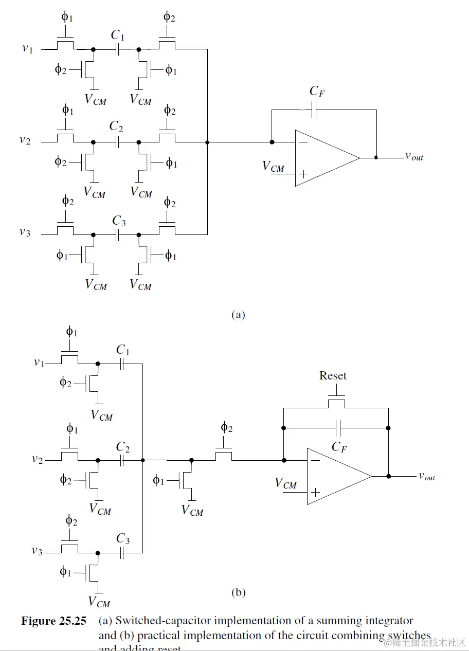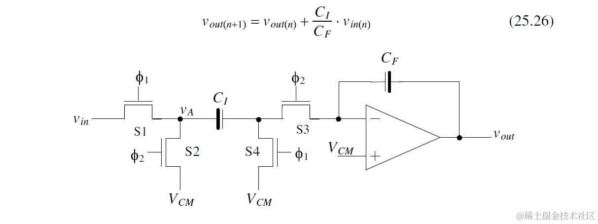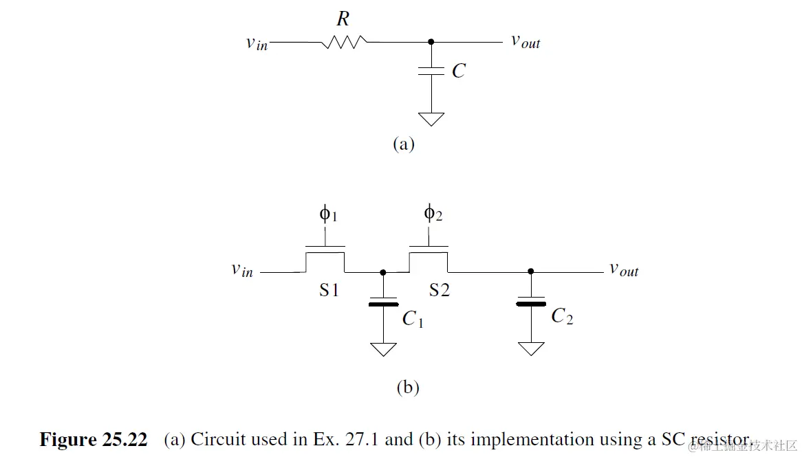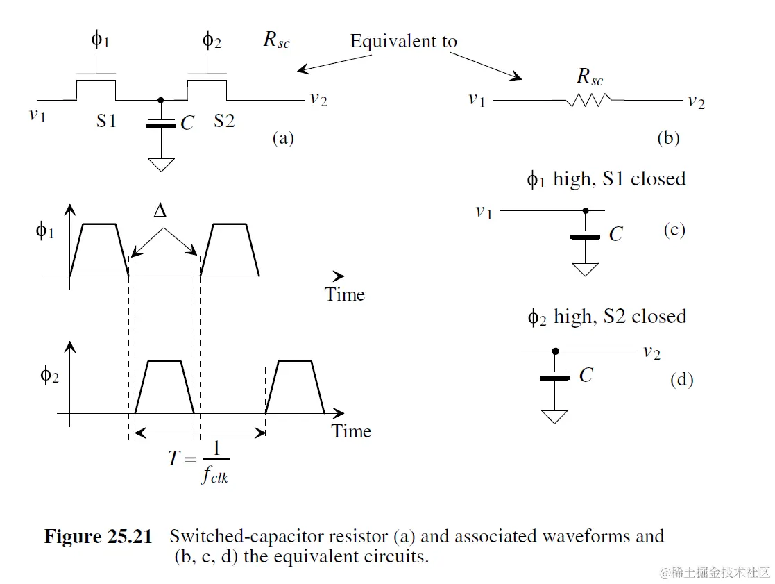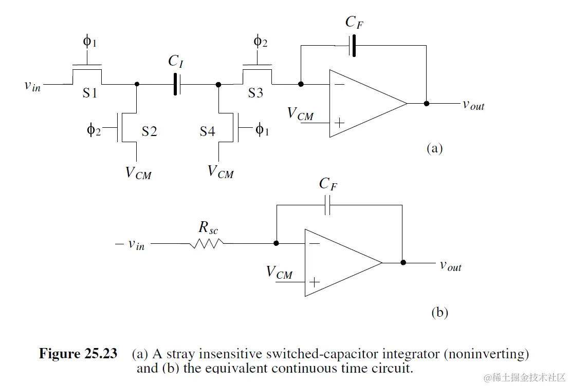Fig25.21a)的switched-capacitor resistor对寄生电容很敏感, 用处不太多, 考虑下图的switched-capacitor integrator.