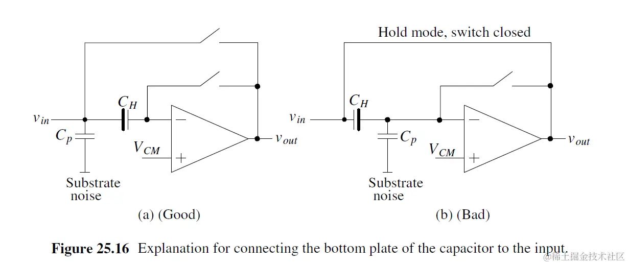 注意CH电容下级板bottom plate应该接Vin signal而不是Op-amp input. 如果结成(b)这样, substrate的noise会直接影响op-amp的输入和输出. 另外substrate电容会增大setting time.