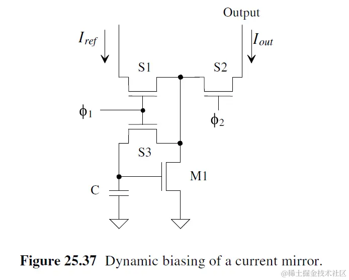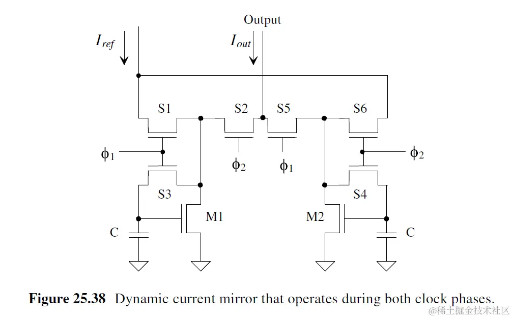 当ph2=high, S1, S3 off, S2 on. 电流Iout流过M2,M1, Iout=Iref, neglecting channel length modulation.