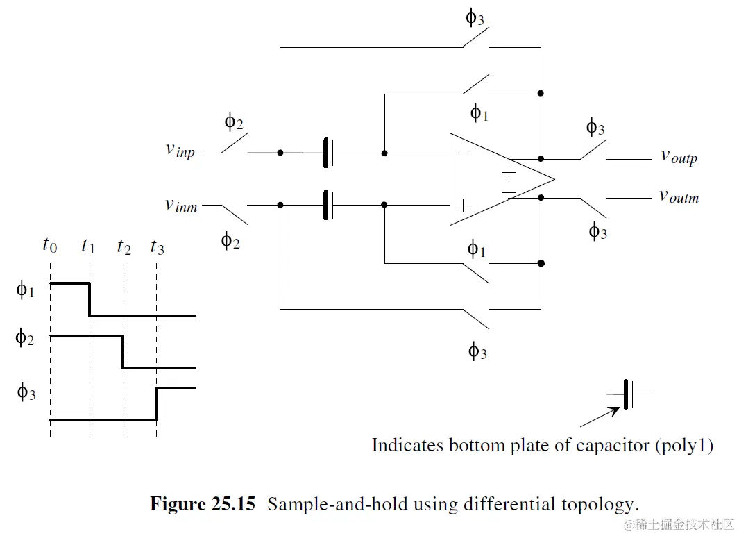 At t1, switch off. charge injection and clock feedthrough作为input common-mode被reject. t1-t2, inputs of the op-amp = VOFF1+VCM. 时间要短