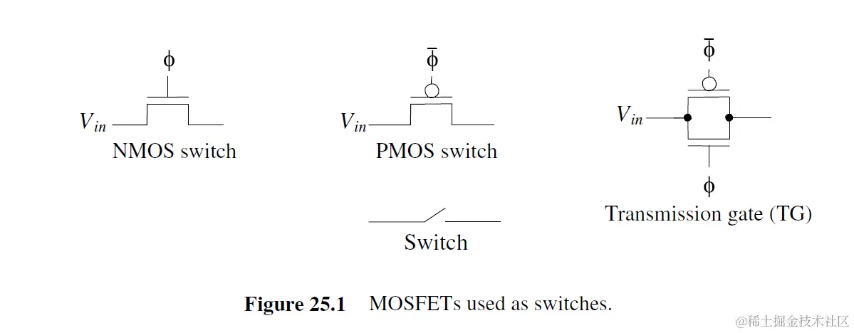 用NMOS做switch, 能传递最大电压为VDD-Vthn. 用PMOS做switch, 能传递最小电压为Vthp. 所以也可以用NMOS并联PMOS作为Transmission Gate (TG)