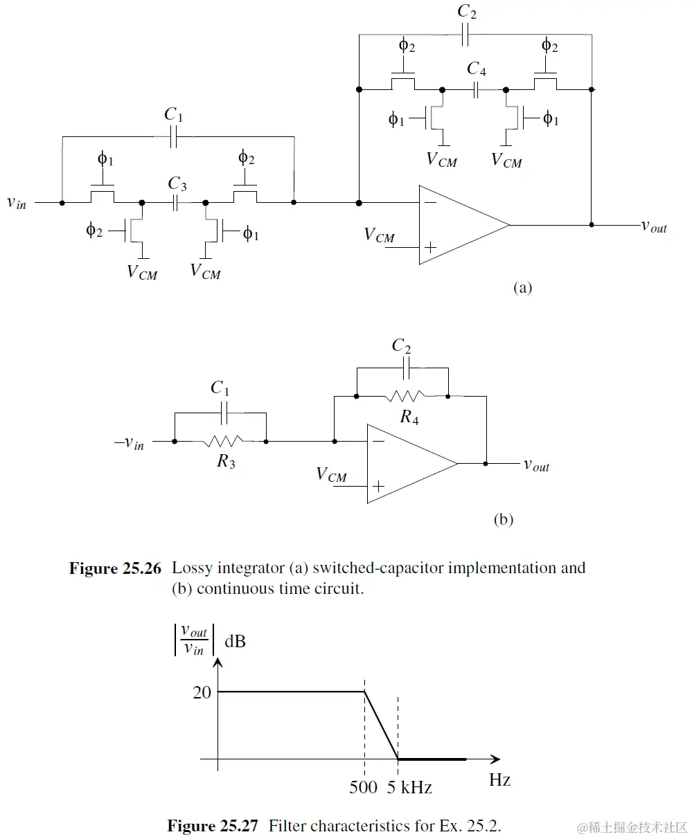 Fig. 25.26展示了lossy integrator (cap上并联一个resistor 用来 prevent the capacitor from storing charge due to offset currents and voltages at the input), 用于first-order filter design.
