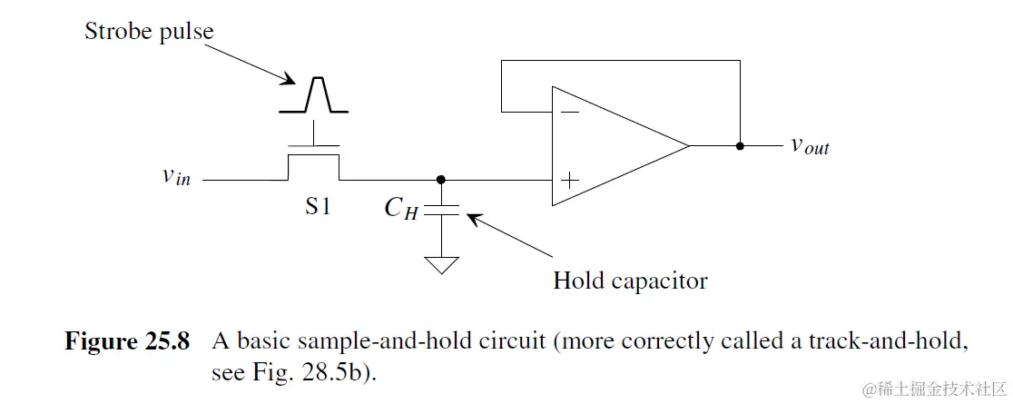 上图是最简单的sample-and-hold电路, op-amp作为unity gain buffer. 在strobe signal on时, CH需要能charge到vin.