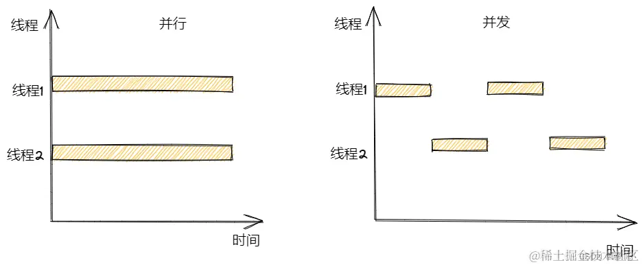 - 并行指多个线程在一段时间的每个时刻都同时运行,并发指多个线程在一段时间内同时运行(不是同一时刻,一段时间内交叉执行)