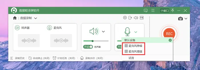 它拥有麦克风降噪与麦克风增强功能,能让音频文件更加清晰,并且可以同时录制电脑内部声音与电脑外部声音,满足您的不同需求。以下是使用数据蛙录屏软件进行录制音频的操作步骤: