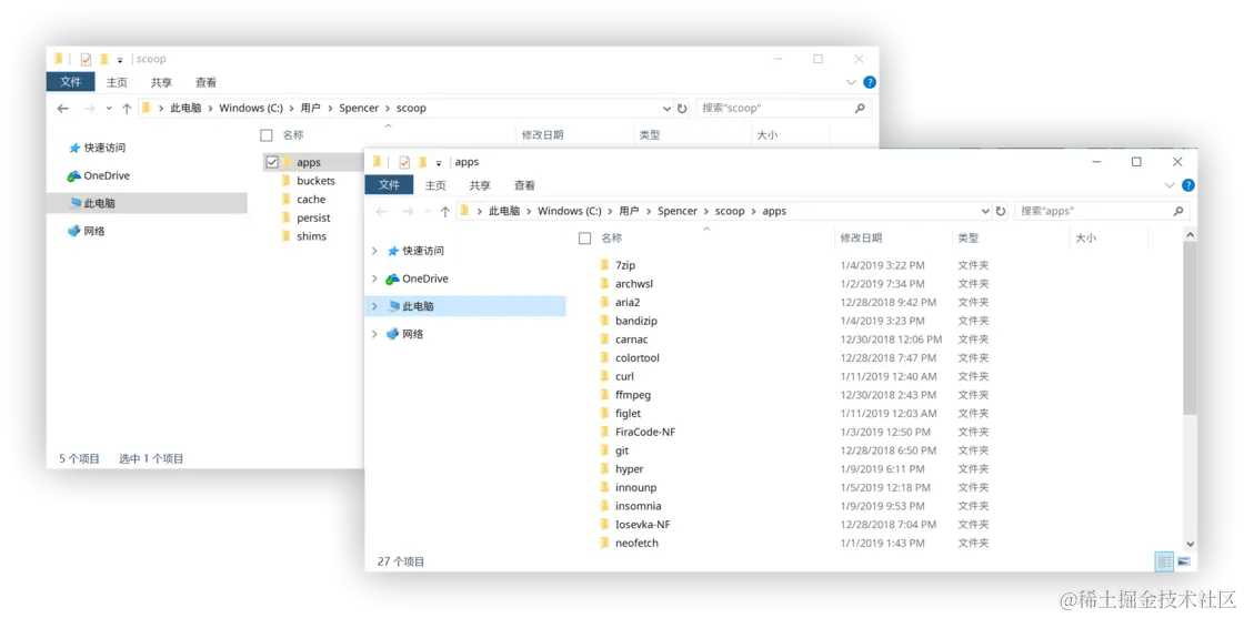 可以看到,scoop 文件夹下的 apps 存放有安装的所有应用。值得一提的是:scoop 是通过 shim 来软链接一些应用,这样的设计让应用之间不会互相干扰,十分方便。