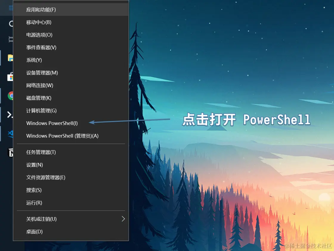 之后,右键开始菜单按钮,在右键菜单中打开 PowerShell: