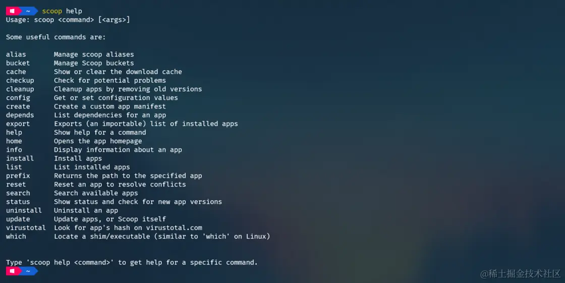 这样就表明我们 Scoop 已经成功安装了。scoop help 这个命令就是 Scoop 的使用说明书,如果我们记不住某个命令怎么执行,也可以通过 scoop help 来唤起这个命令参考说明。
