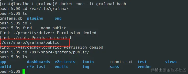 Docker 安装的 Grafana 前端页面的目录位于容器中的 /usr/share/grafana/public/ 目录下。