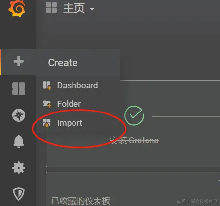 - 登录Grafana,点击左上角的+号,选择Import。