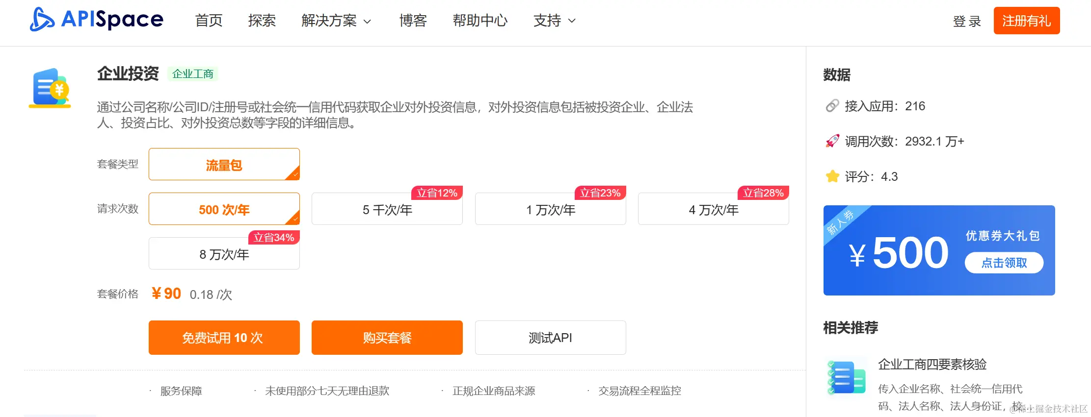 注册登录 APISpace,进入 企业投资 的接口详情页,申请接口。