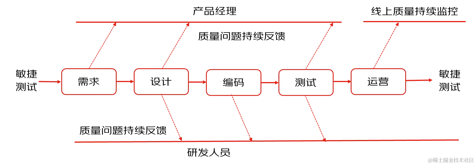 质量不在测试阶段产生,更不在测试阶段结束,质量贯穿整个产品生命周期中的每个环节,包括方案设计、开发、测试、发布、运营及下线。在敏捷开发模式中,测试人员会尽早开始测试,包括对需求、研发设计及测试用例的及时评审,更重要的是,能够及时、持续对产品/项目/需求质量进行反馈,可以总结为下图:
