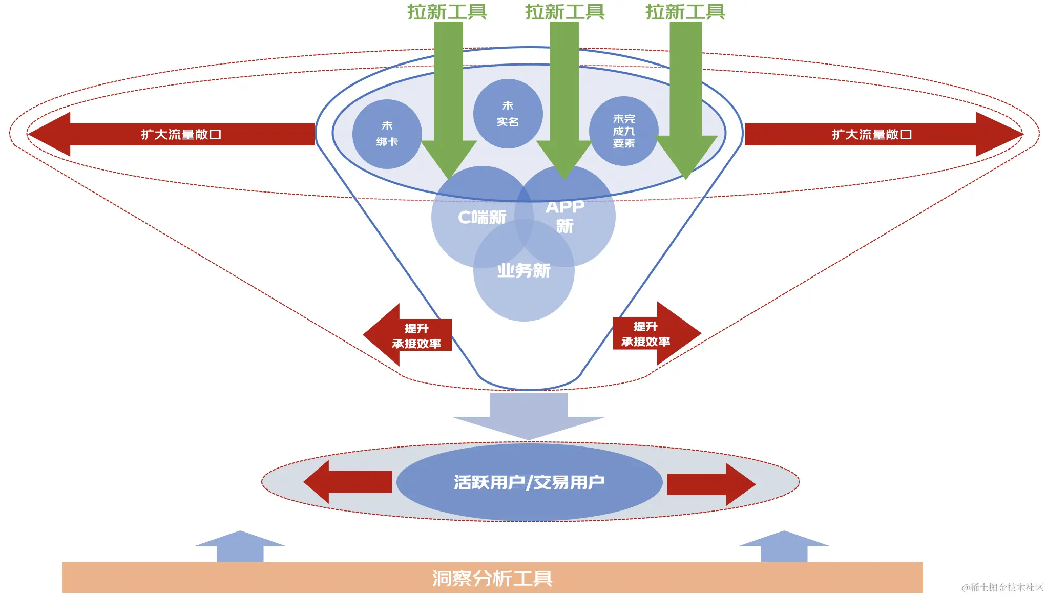 大促会场是指我们在618、双十一、年货节等大型活动期间推出的会场页面,通过展示不同的利益点、玩法、商品楼层以及推荐算法,来吸引不同身份的用户进行转化;C端拉新活动的表现形式主要包括在金融场、零售场及外场(微信、抖快、其他app)投放拉新各类活动,同时结合节日、社会热点等进行营销活动投放,此外还可以通过玩游戏的方式引导用户进行实名认证、完成九要素、绑卡、开通金融业务等业务转化;"一分购"系列是典型的拉新工具,针对新客支付一分钱购买的形式实现业务转化,包括一分系列工具等项目。若按照拉新的策略分类,可以分为拉新工具、扩大流量敞口、提升承接效率三类项目,如下图所示: