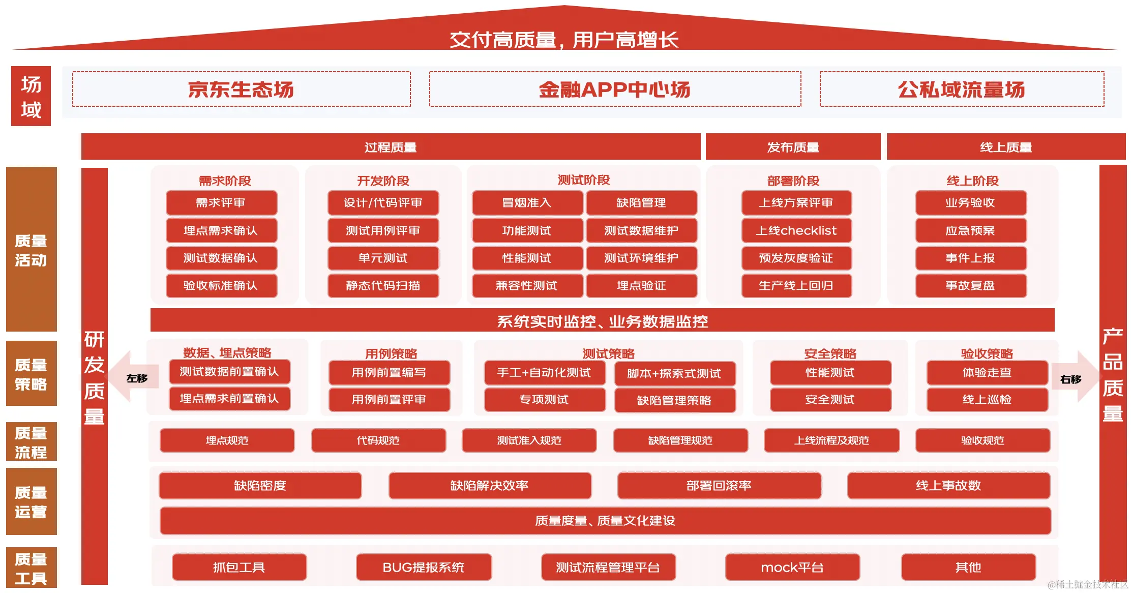 测试左移主要目标是把质量活动前置,通过各种缺陷预防工作,有效减少后期的问题修复成本。在用户增长的质量实践中,除了在在需求评审主动识别业务流程断点、异常流程、分支流程、测试数据和测试物料诉求、验收标准等常规问题之外,我们对测试用例进行了前置,通过测试用例的梳理和评审,给与研发设计和代码编写更多的输入,提前识别业务流程及需求交付过程中的问题,并及时与产品和开发进行沟通。测试右移指对质量的把控延伸到系统上线之后及日常的运营和运维过程中,通过日常的人工巡检、自动化巡检、体验治理等方式,及时发现和用户体验问题。总结来说,测试左移和右移只是一个形象的表述,其核心是质量保证不应该仅仅针对测试执行阶段,而应该贯穿于研发质量管理的各阶段及需求交付的全生命周期。