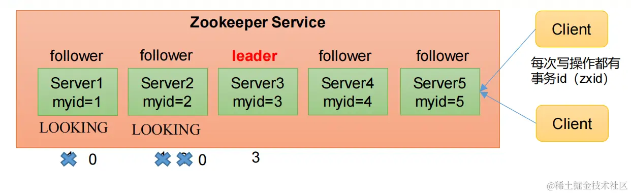 按照前面所说的5台机器集群组成集群,加入某个时刻leader服务3和服务器5发生了故障,这时候集群就没有leader,就会重新选举leader,