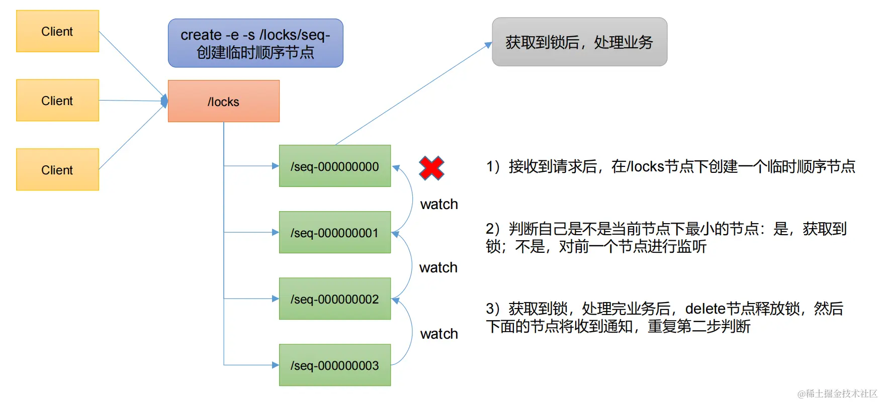 比如说,第一个客户端来搞一个顺序节点,zk内部会给起个名字叫做:seq-00000000。然后第二个客户端来搞一个顺序节点,zk可能会起个名字叫做:seq-00000001。大家注意一下,最后一个数字都是依次递增的,从1开始逐次递增。zk会维护这个顺序。实现原理如下图所示: