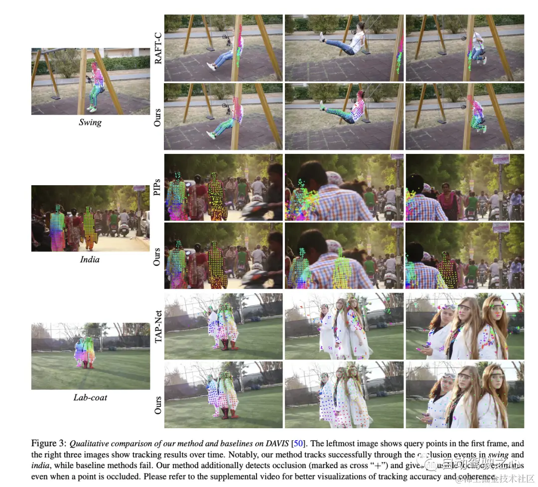 - 结果特点:优化后,这种表示可以用视频中任何帧的任何像素进行查询,从而生成一个跨整个视频的平滑、准确的运动轨迹。这个方法还能识别何时有点被遮挡,并且可以跟踪经过遮挡的点。