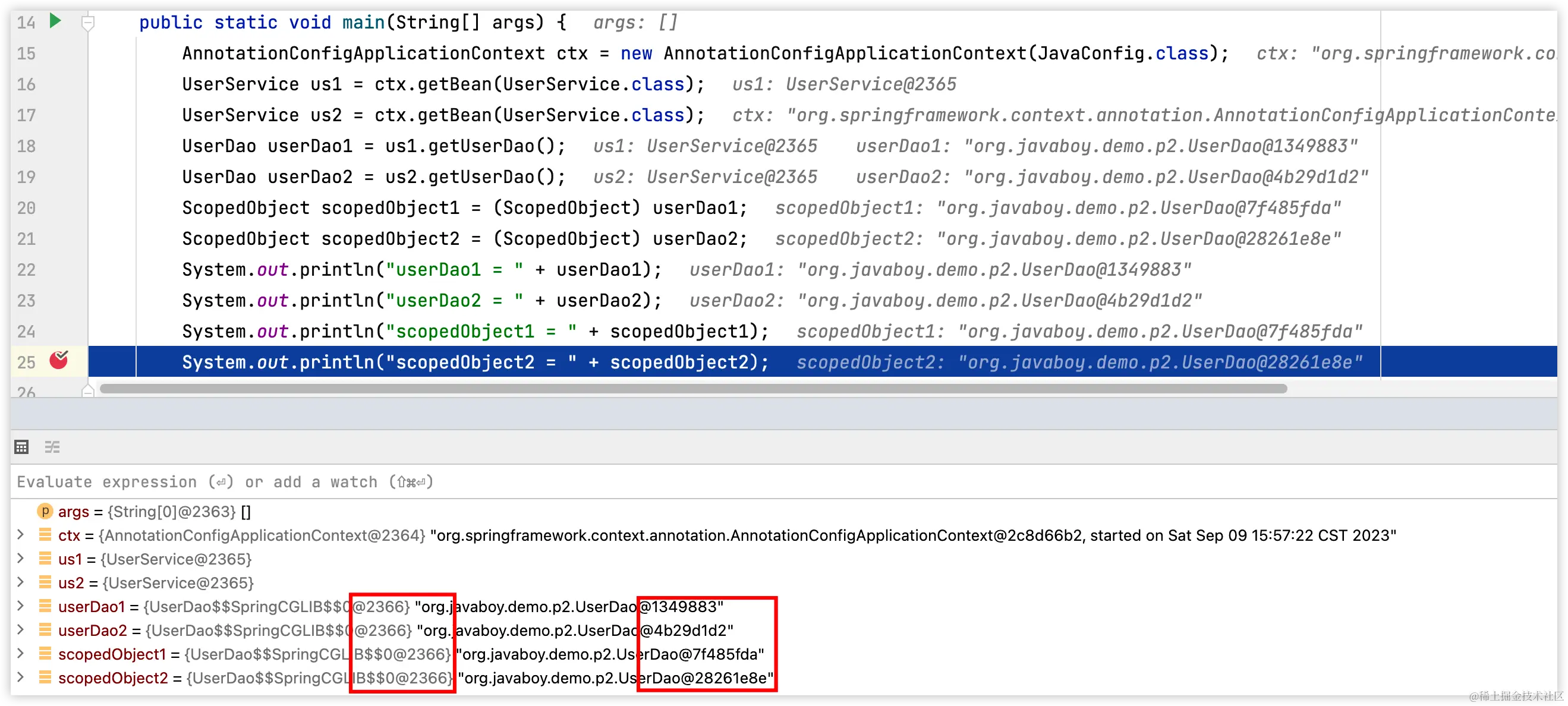- 从 UserService 中多次获取到的 UserDao,其实也是 ScopedObject 对象。