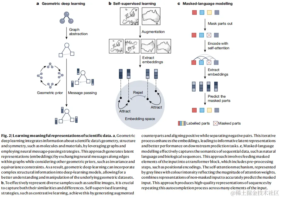 深度学习可以在不同的抽象层次上提取科学数据的有意义的表示,并优化它们以指导研究,通常是通过端到端学习(Box 1)。高质量的表示应该保留尽可能多的关于数据的信息,同时保持简单和可访问的信息。科学上有意义的表征是紧凑的、有区别的,解开变异的潜在因素,并编码概括许多任务的潜在机制。在这里,论文介绍了三种新兴的策略来满足这些要求:几何先验、自我监督学习和语言建模。
