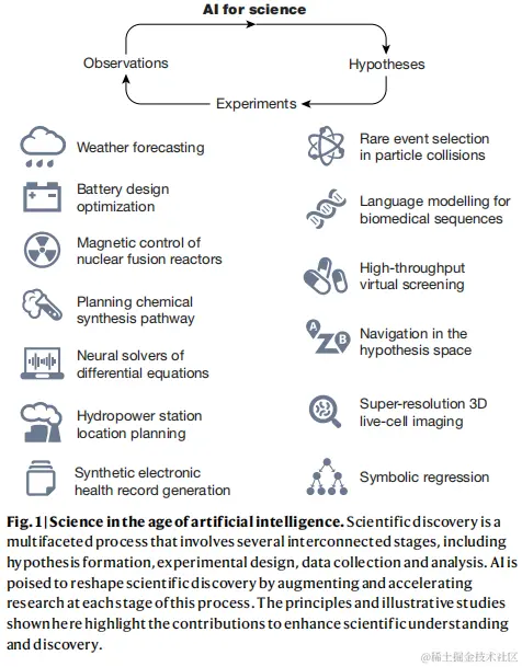 尽管科学实践和程序在科学研究的各个阶段有所不同,但人工智能算法的发展跨越了传统上孤立的学科(图1)。这种算法可以加强科学研究的设计和执行。通过优化参数和功能、自动化收集、可视化和处理数据的程序、探索候选假设的广阔空间、生成假设并估计它们的不确定性以提出相关的实验性,它们正成为研究人员不可或缺的工具。