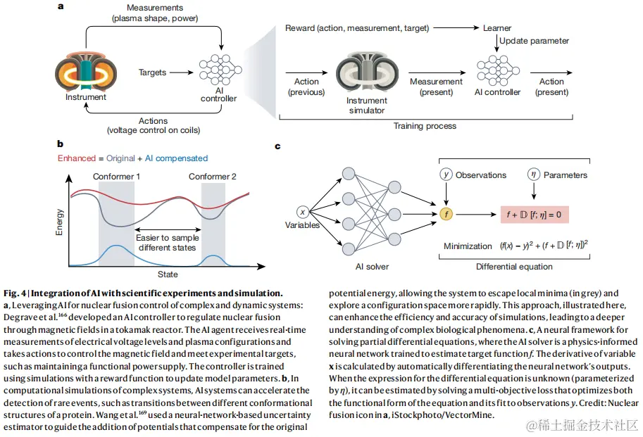 在一个正在进行的实验中,决策必须经常进行实时调整。然而,当仅仅由人类的经验和直觉来驱动时,这个过程可能是困难的,而且容易出错。强化学习提供了一种替代方法,可以不断地对进化的环境做出反应,并最大限度地提高实验的安全性和成功性。例如,强化学习方法已被证明对托卡马克等离子体的磁控制是有效的,其中算法与托卡马克模拟器交互,以优化控制过程的策略(图4a)。在另一项研究中,强化学习代理使用风速和太阳高度等实时反馈来控制平流层气球,并找到有利的导航风速。在量子物理学中,实验设计需要动态调整,因为未来复杂实验物化的最佳选择可能会违反直觉。强化学习方法可以通过迭代设计实验并接收实验反馈来克服这一问题。例如,强化学习算法已被用于优化量子系统的测量和控制,其中它们提高了实验效率和准确性。