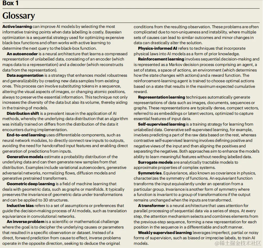 自2010年代初以来,由于大型数据集的可用性,在快速和大规模并行计算和存储硬件(GPU和超级计算机)的辅助下,以及结合大规模并行计算和新算法,人工智能方法的能力得到了极大的提高。后者包括深度表示学习(Box 1),特别是多层神经网络,能够识别基本的、紧凑的特征,这些特征可以同时解决构成科学问题基础的许多任务。其中,几何深度学习(Box 1)已被证明有助于整合科学知识,以物理关系、先验分布、约束和其他复杂描述符的紧凑数学陈述呈现,如分子中原子的几何形状。自监督学习(Box 1)使得在标记或未标记数据上训练的神经网络能够将学习到的表示转移到不同的领域,但很少有标记的例子,例如,通过预先训练大型基础模型,并使它们适应,以解决不同领域的不同任务。此外,生成模型(Box 1)可以估计一个复杂系统的底层数据分布,并支持新的设计。与人工智能的其他用途不同,强化学习方法(Box 1)通过探索许多可能的场景,并根据预期的实验分配不同的行动等指标,找到环境的最佳策略。