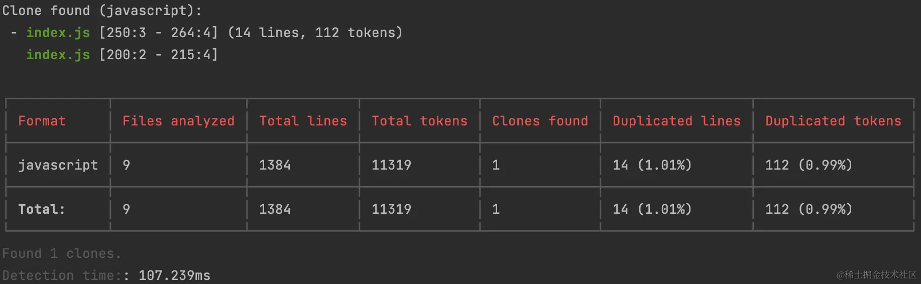 Clone found (javascript): 显示找到的重复代码块,这里是javascript文件。并且会显示重复代码在文件中具体的行数,便于查找。