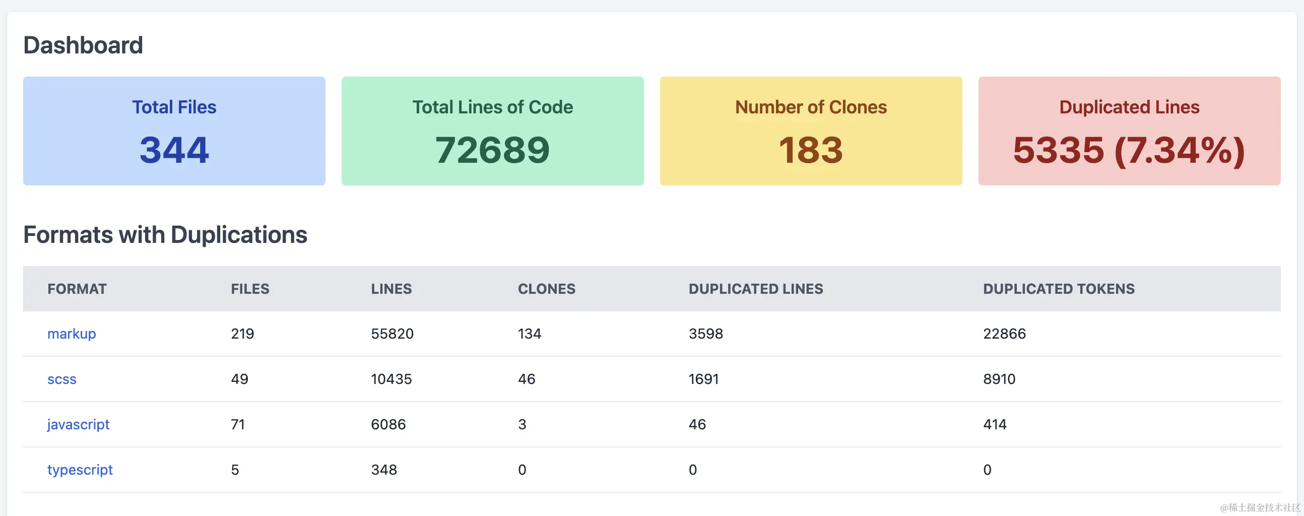 - format:需要进行重复度检测的源代码格式,目前支持150多种,我们常用的如 javascript、typescript、css 等