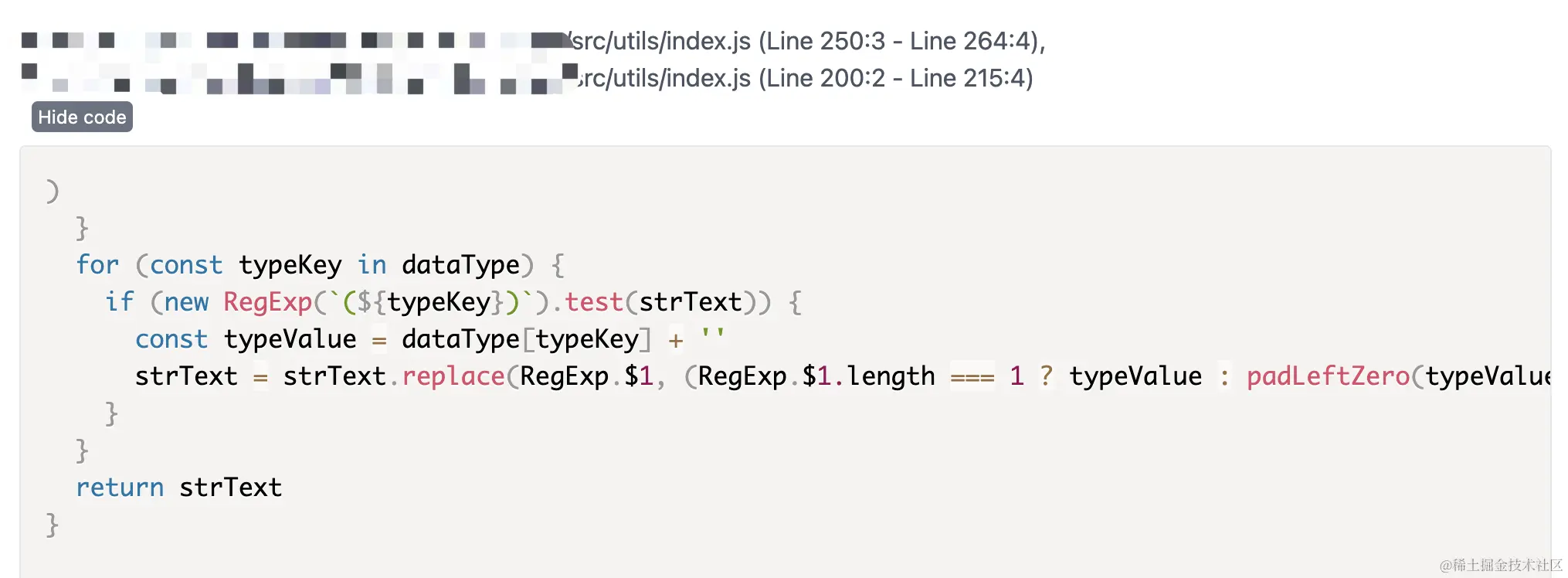 上面所提到的ignore可以忽略某个文件或文件夹,还有一种忽略方式是忽略文件中的某一块代码。由于一些重复代码在实际情况中是必要的,可以使用代码注释标识的方式忽略检测,在代码的首尾位置添加注释,jscpd:ignore-start 和 jscpd:ignore-end 包裹代码即可。