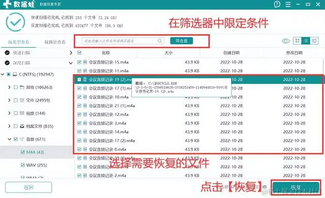 4.深度扫描结束后,扫描到的数据会比较多,可以直接对文件进行选择,也可以借助 【筛选器】快速定位,完成操作后,点击【恢复】。