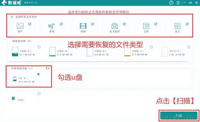 2.可以选择需要扫描的文件类型(为了数据扫描更全面,建议全选),勾选u盘盘符,点击 【扫描】 ;
