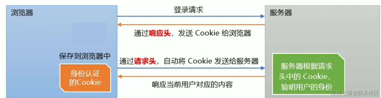 服务器开辟空间存储登录信息,生成cookie传回浏览器,浏览器请求的时候通过cookie自动发送信息给服务器,通过身份验证