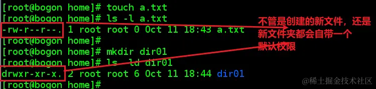 当在Linux下创建一个新文件或文件夹时,就算没有设定权限,也会自带一个默认权限,下图这种情况就是 umask 的原因。